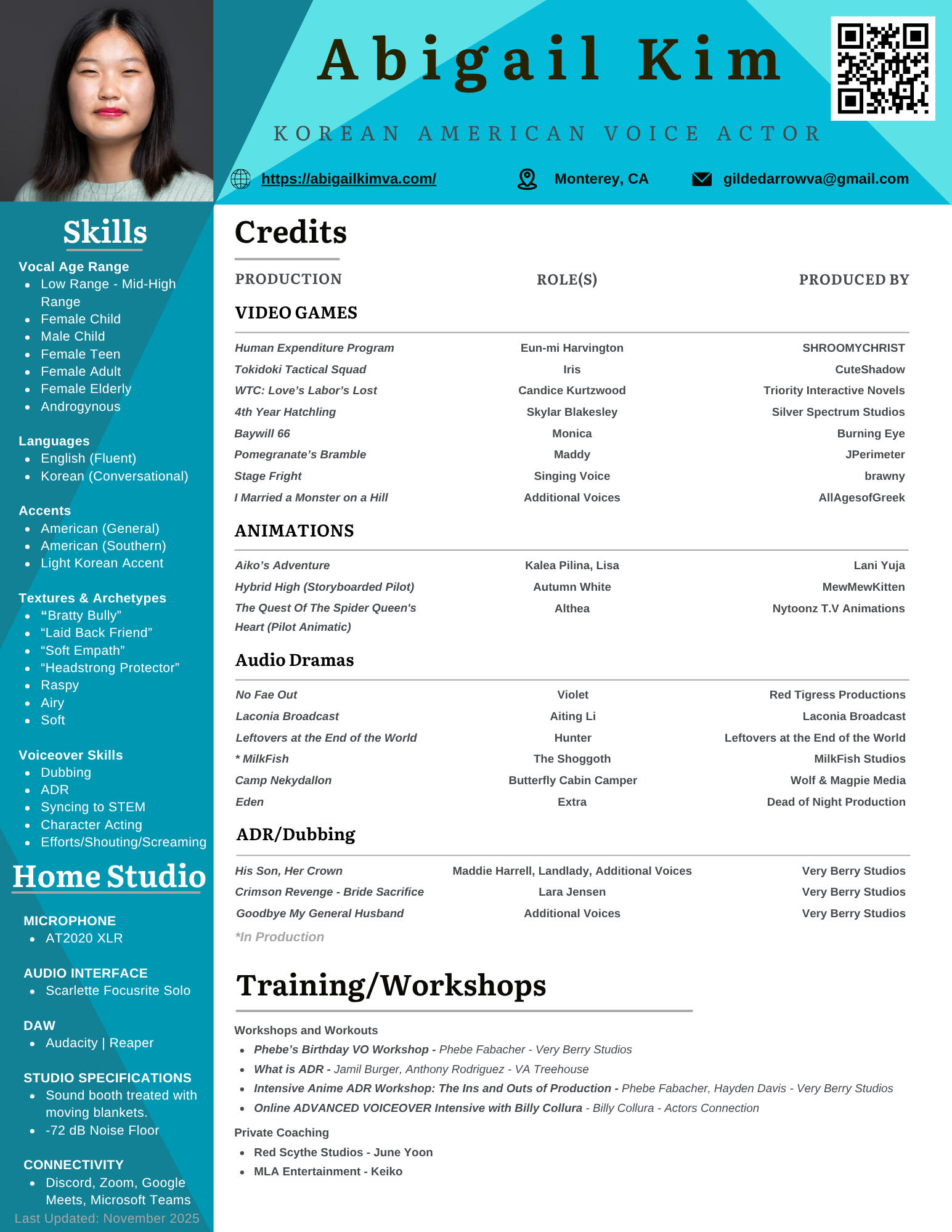 Hello there and thank you for checking out my about me section!Allow me to introduce myself! My name is Abigail Kim and I am a Korean American and bigender (female and non-binary) voice actor!